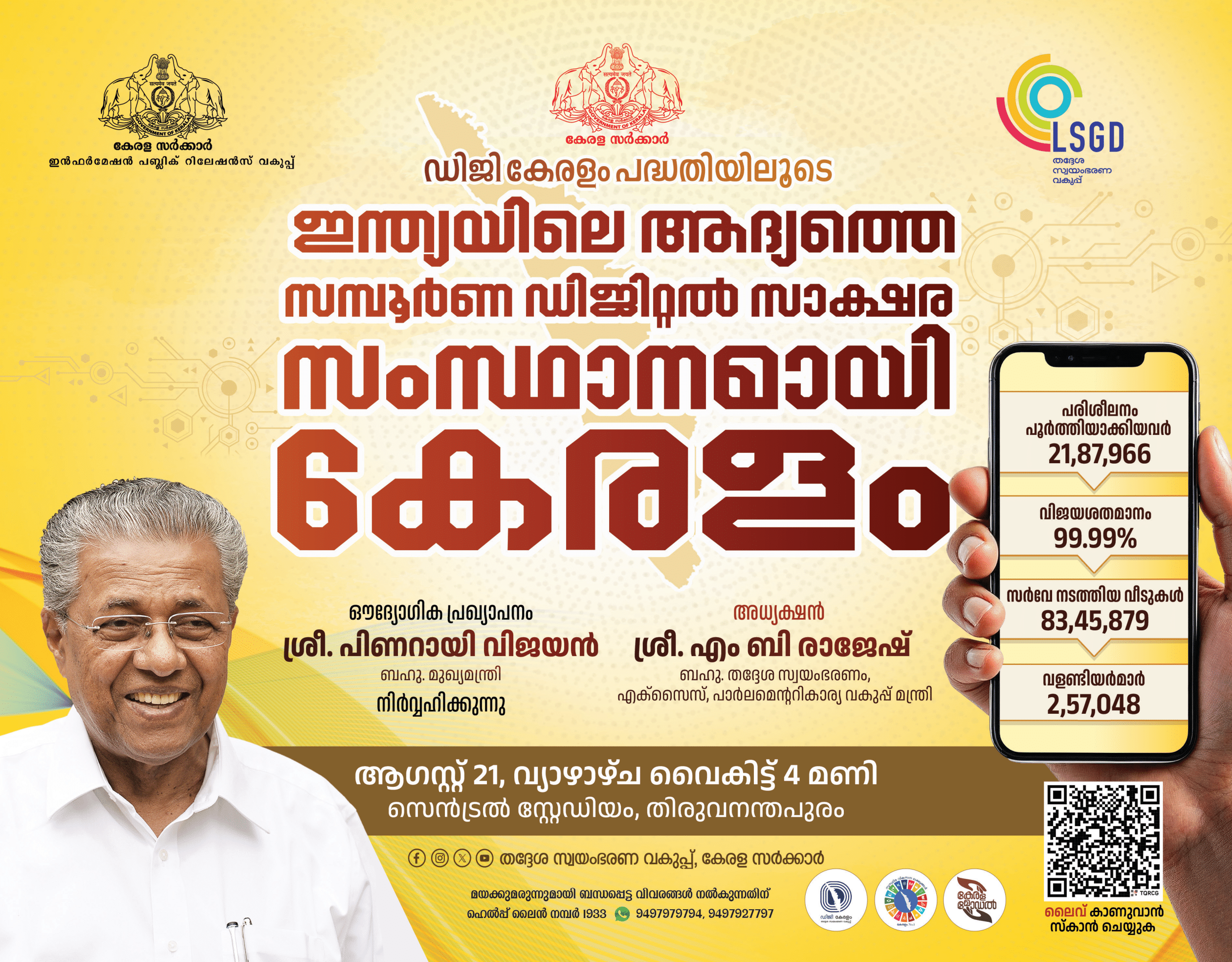 ഇന്ത്യയിലെ ആദ്യത്തെ സമ്പൂർണ ഡിജിറ്റൽ സാക്ഷര സംസ്ഥാനമായി കേരളം